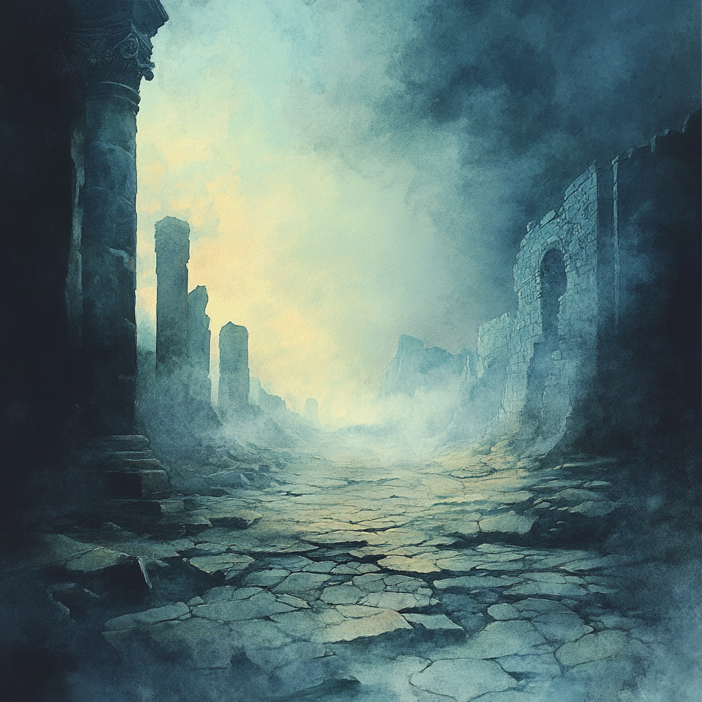 足元に目を向ける。砕けた大地、遠くには崩れかけた神殿の影が見える。